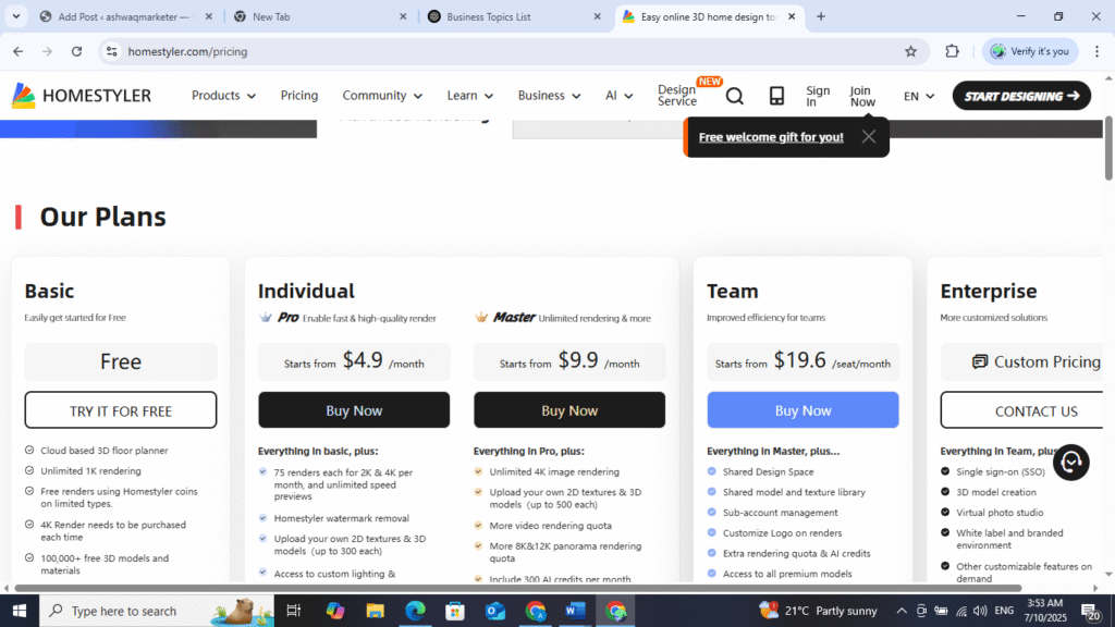 Homestyler also offers Master and Enterprise-level plans for design studios and collaborative teams. These include: